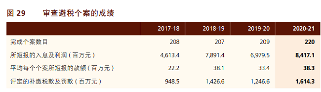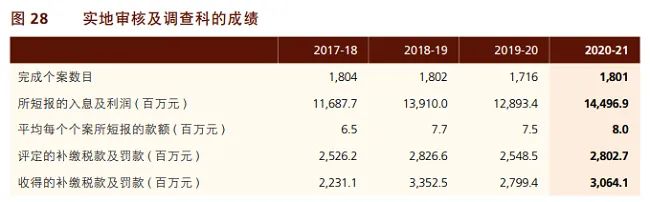 据香港税务局年报数据统计,在2020-21年度,其实地审核及调查科完成了1801宗个案,合共征收约28亿元补缴税款及罚款。其中,包含了220宗避税个案,合共征收约16亿1千万元补缴税款及罚款。