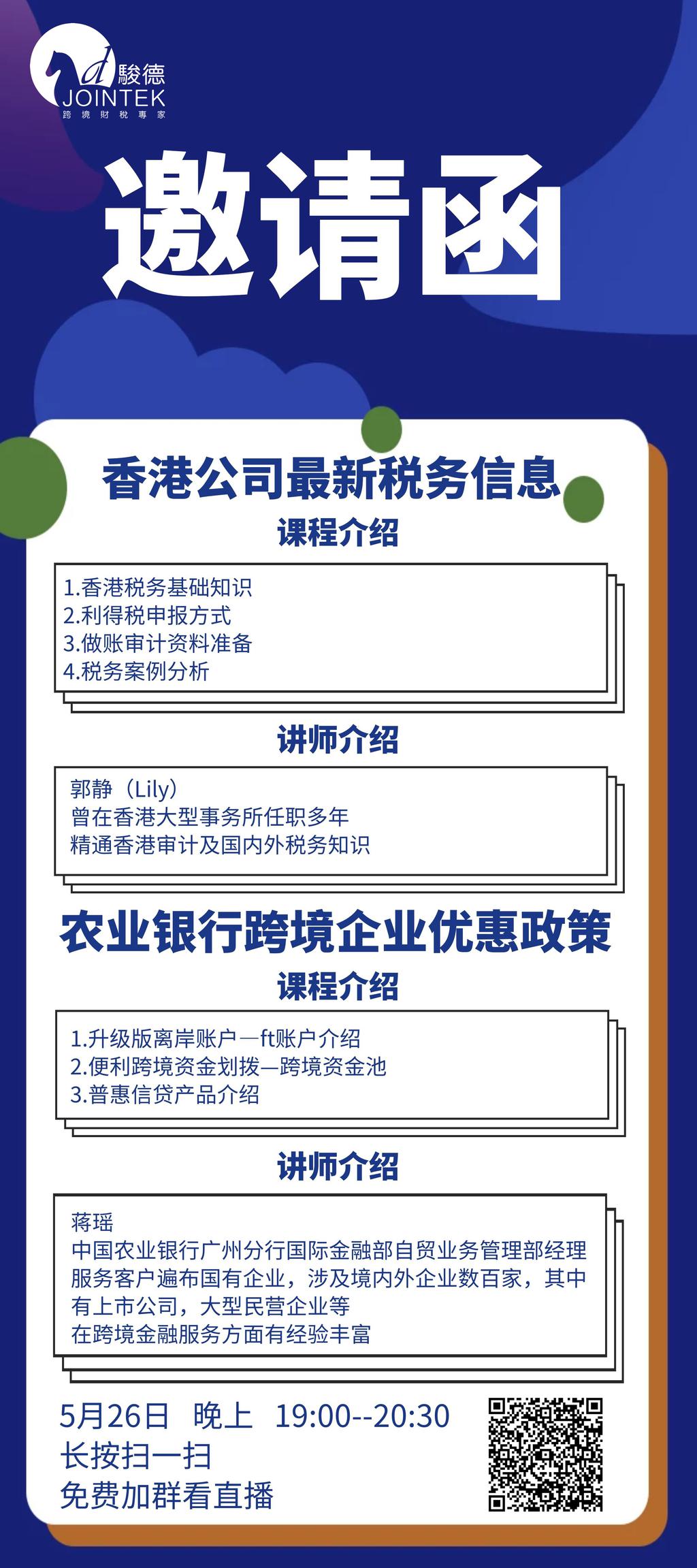 5月26日晚上19点,骏德团队特邀讲师郭静(lily)老师和中国农业银行广州分行国际金融部自贸业务管理部经理蒋瑶将为我们举办一场关于“中国香港公司最新税务信息 & 农业银行跨境企业优惠政策”的线上直播讲座,为我们带来中国香港税务基础知识、利得税申报方式、做账审计资料准备、税务稽查案例分析、升级版离岸账户—ft账户介绍、便利跨境资金划拨—跨境资金池、普惠信贷产品介绍,相信能对您的企业有所裨益,赶快抓紧时间报名!
